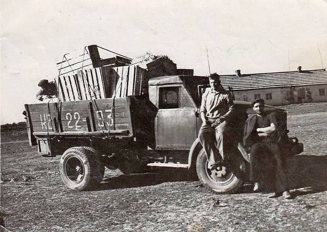 Гараж Опытно семеноводческого хозяйства "Березанское" Кореновский район, Краснодарский край. Крайний слева: нынешний глава Ново-Березанского с/п, в то время механик автогаража.(Волга директора хозяйства)